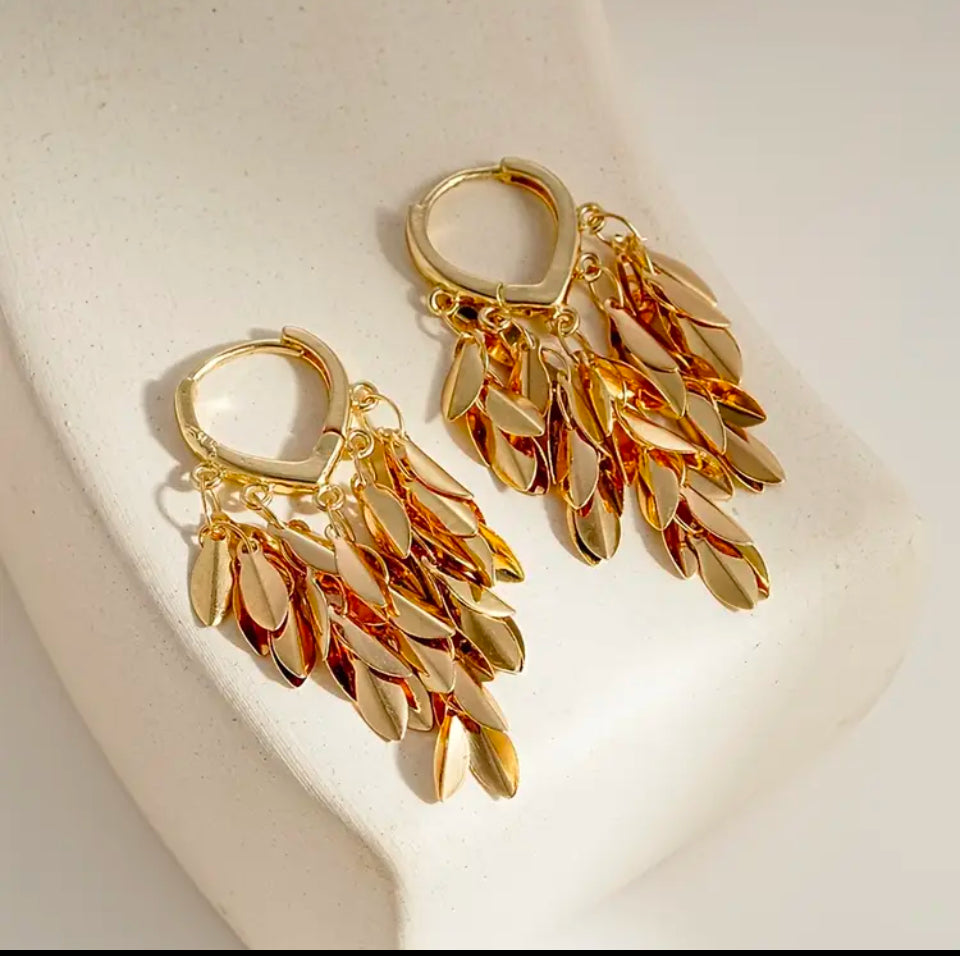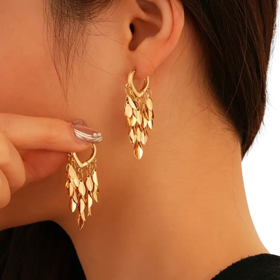 Brinco Argola Pequeno com Franjas De Folhas Penduradas Dourada