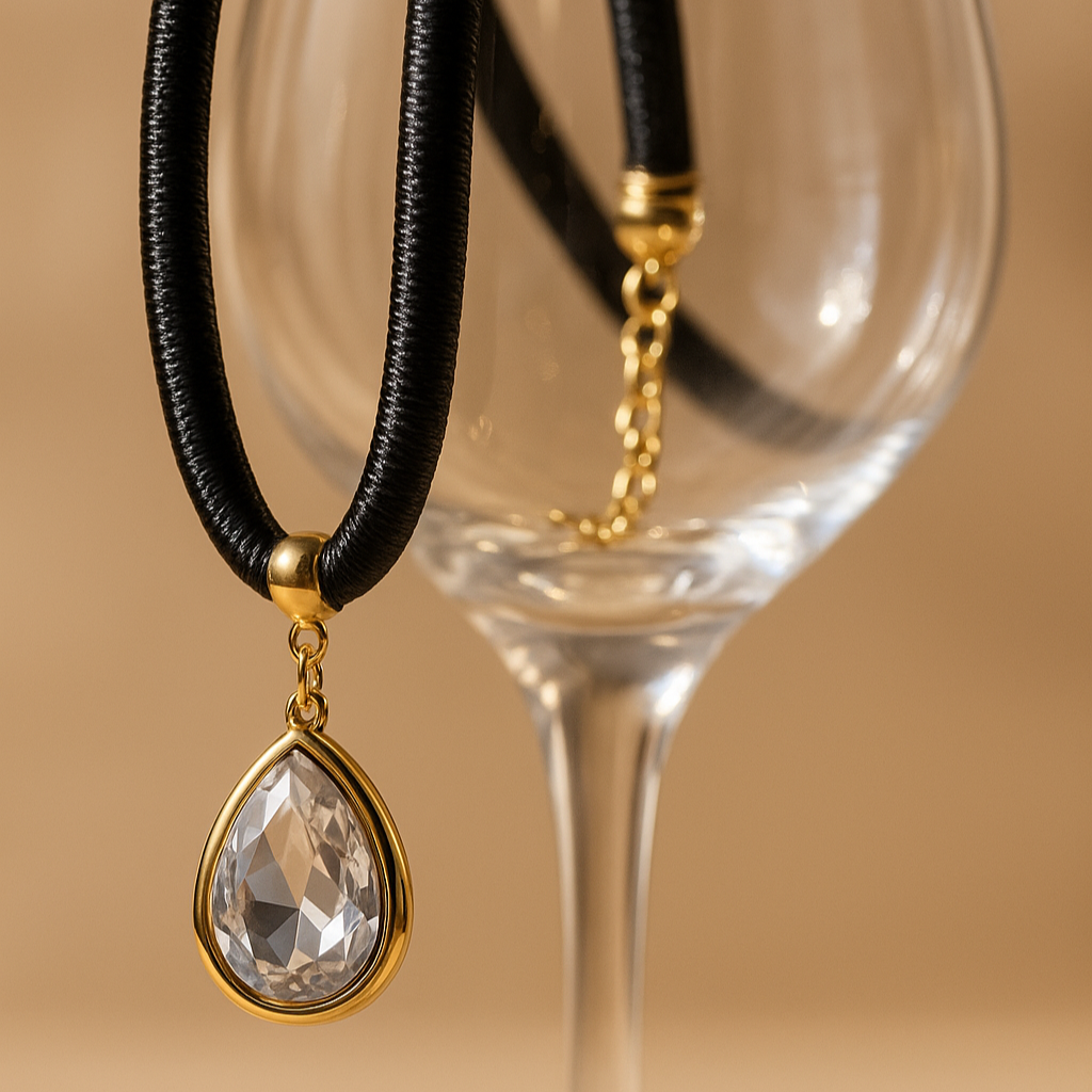 Colar aveludado com pingente gota de cristal.