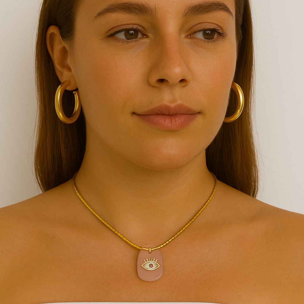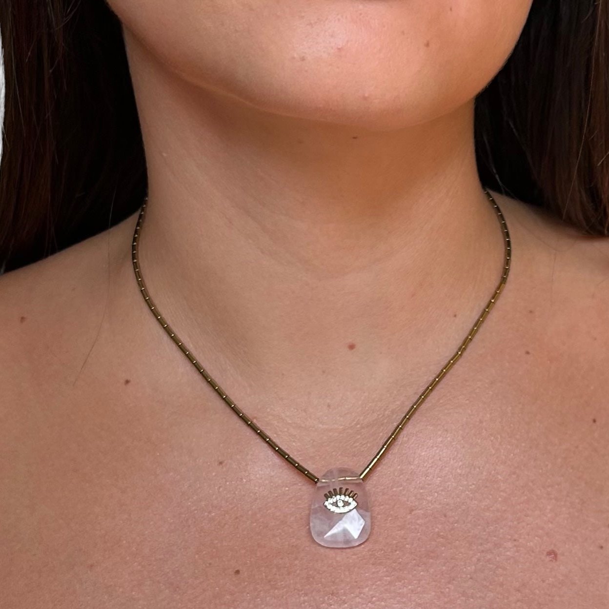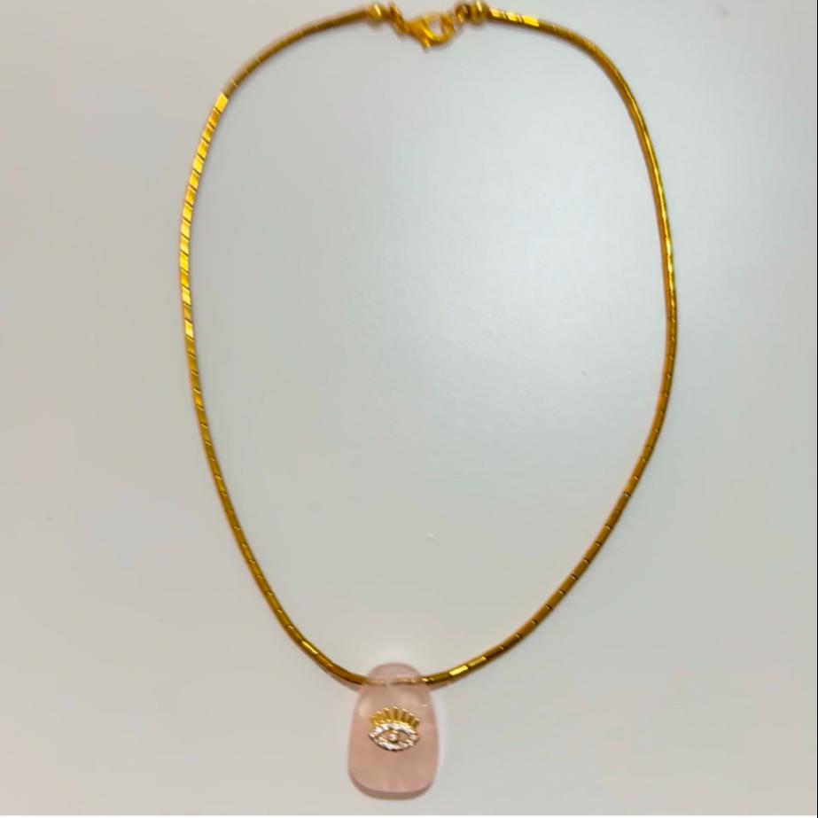 Colar Canutilhos e Pedra Rosa com Olho Grego