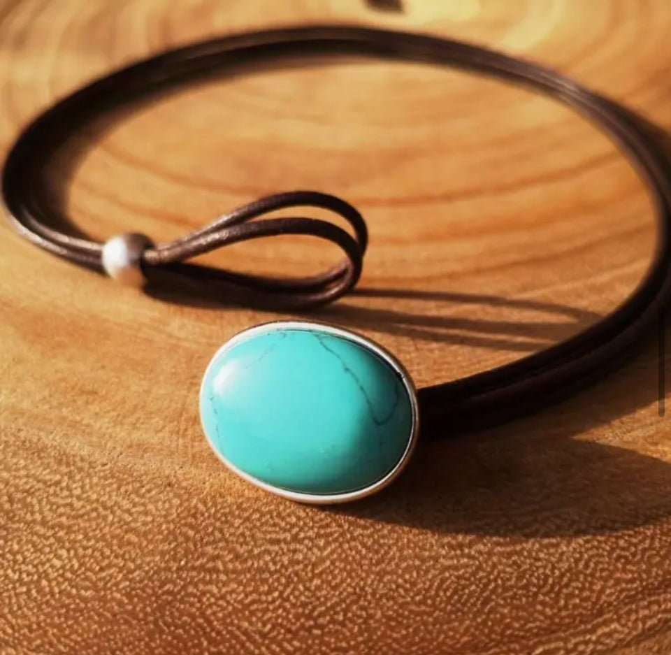 Colar Chocker em Pu com Pedra Turquesa Prateado .