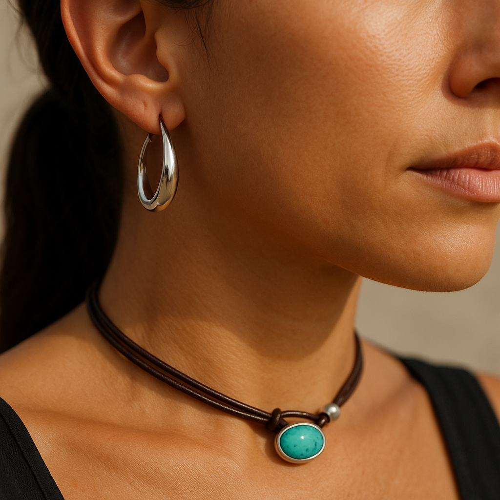 Colar Chocker em Pu com Pedra Turquesa Prateado