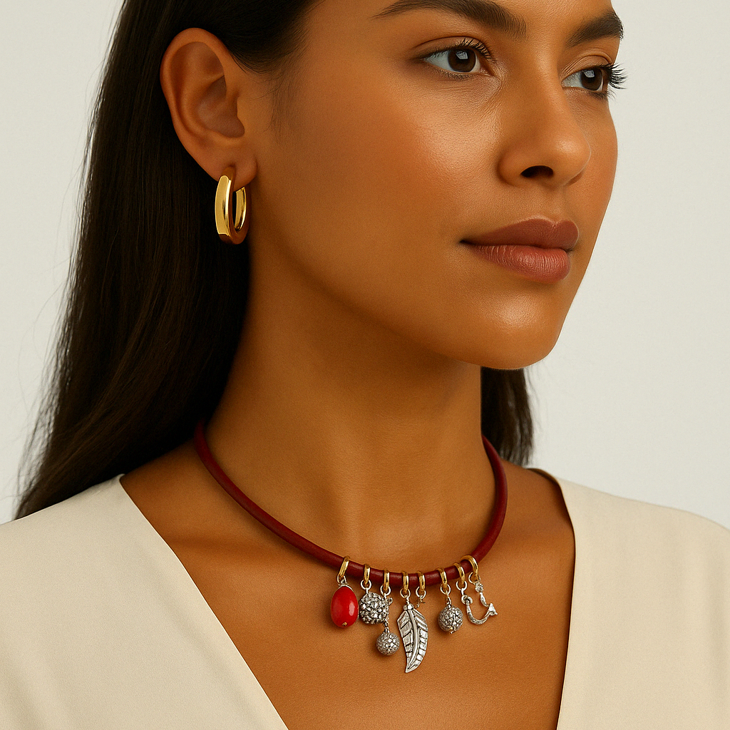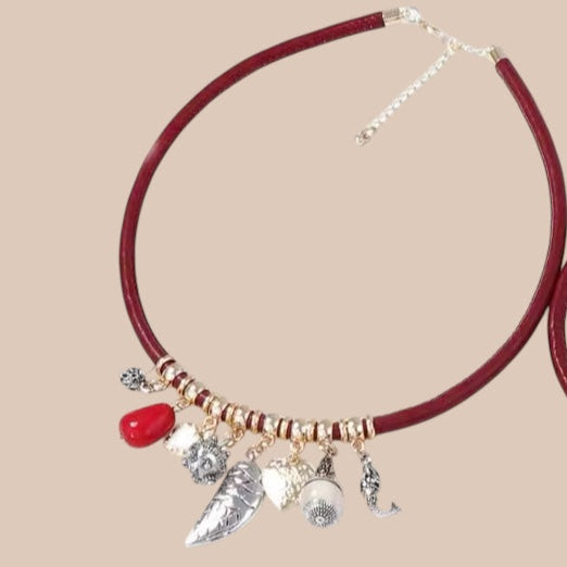 Colar vinho com pingentes variados.