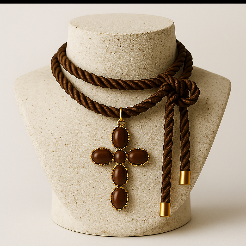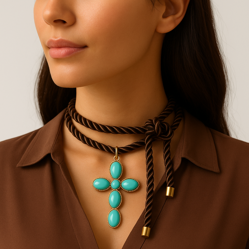 Colar Cordão torcido com Cruz Dourada e Pedras turquesa em Resina