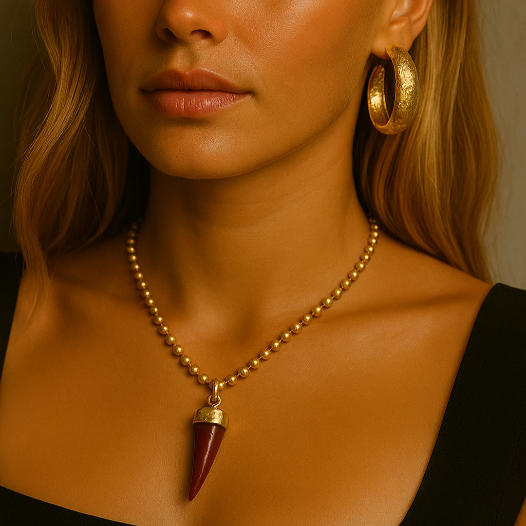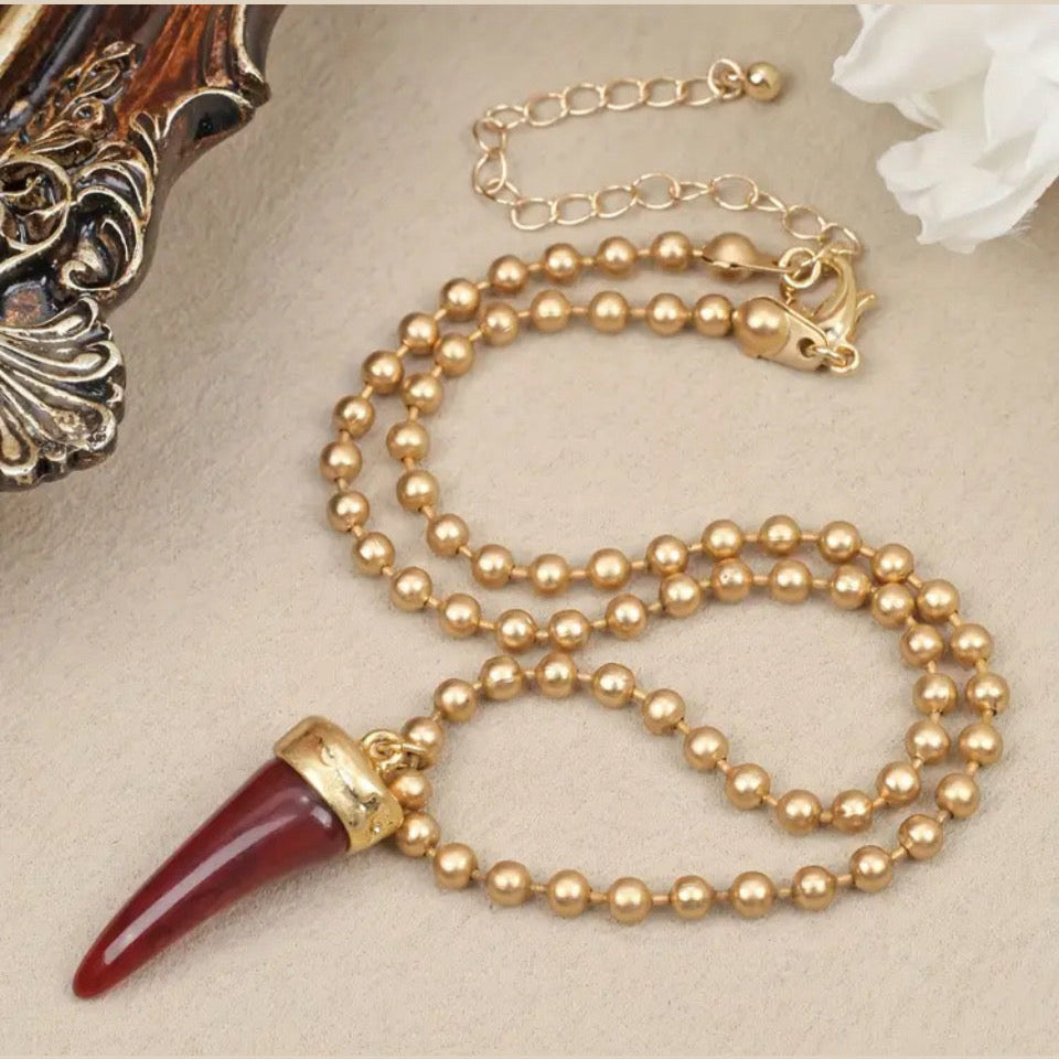 Colar Corrente Bolinha Com Pingente Dente de Sabre Resinha Vinho