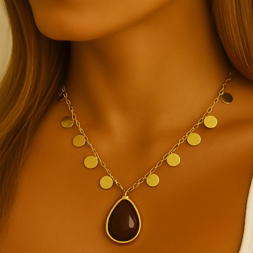 Colar com plaquinhas e pedra gota.