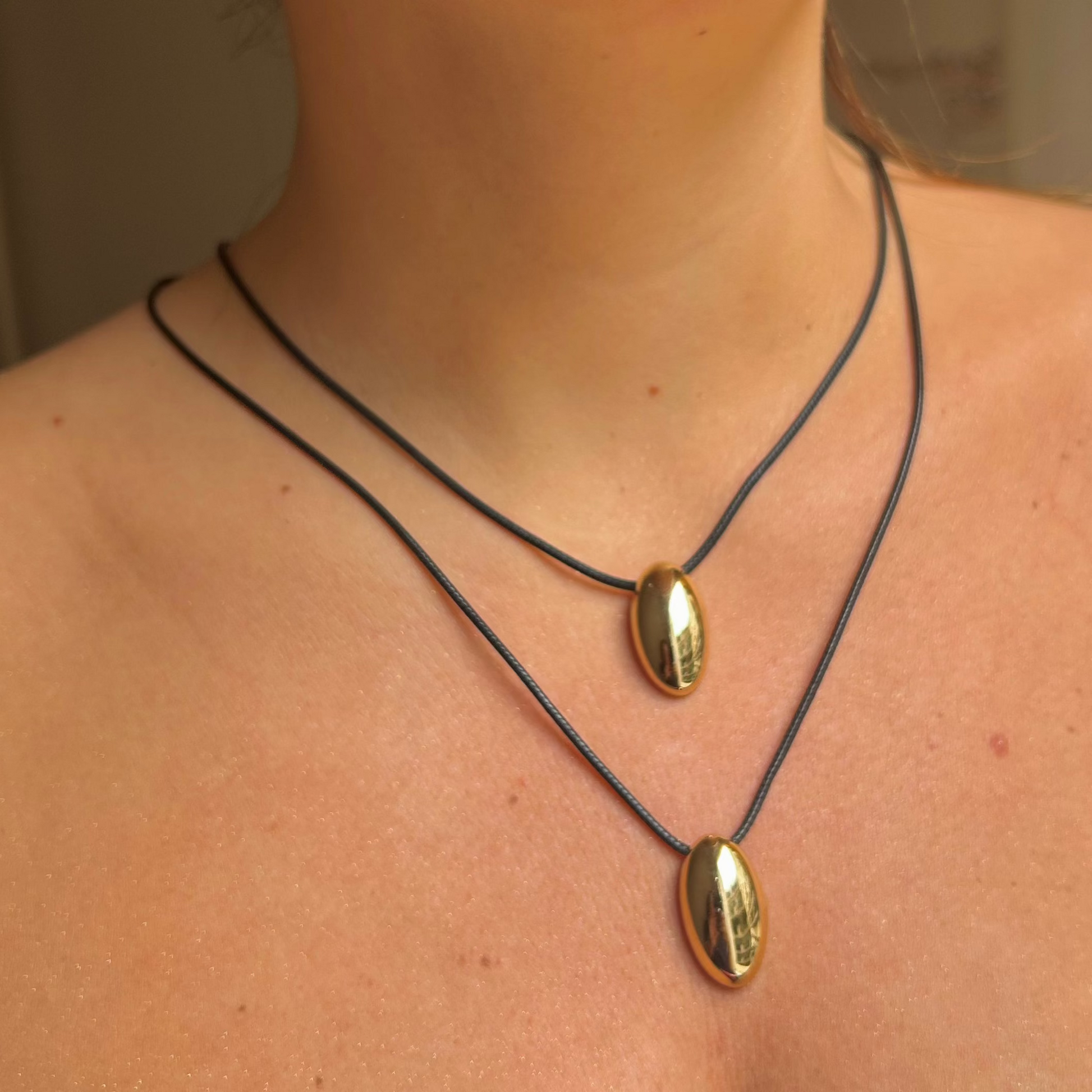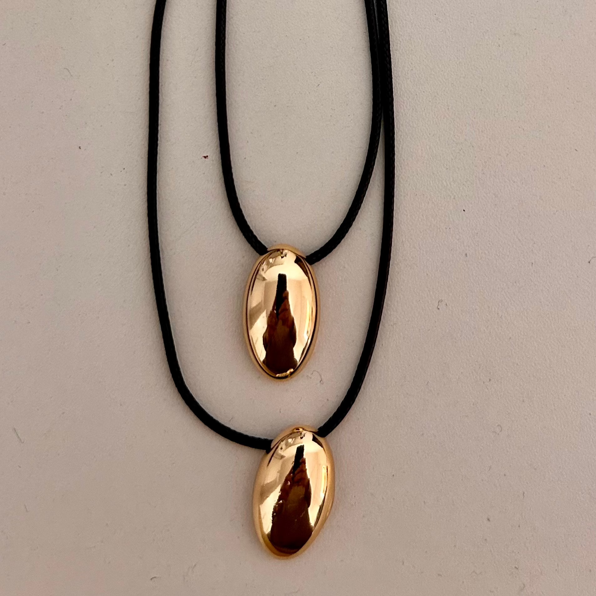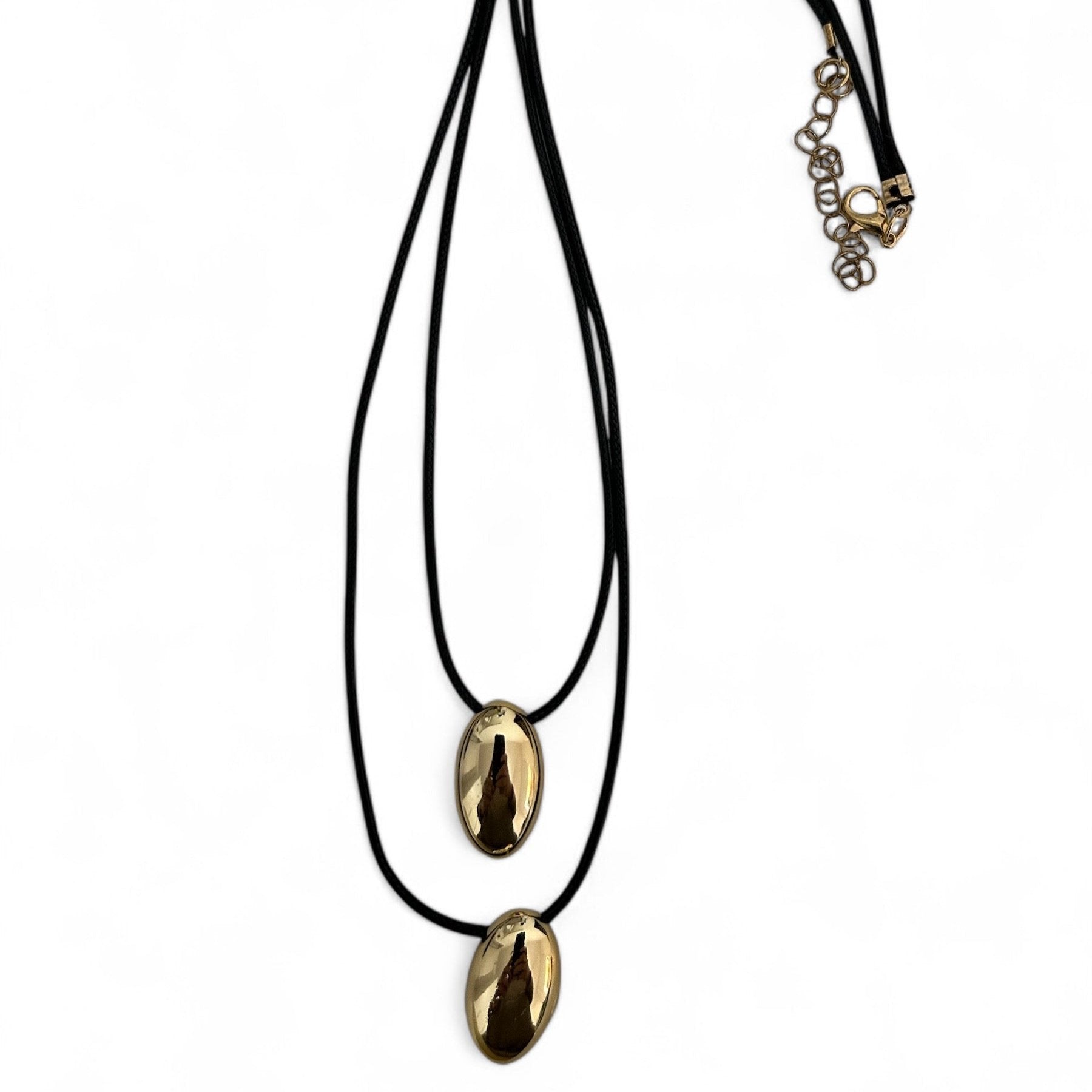 Colar 2 fios preto com pingentes gota folheado dourado.