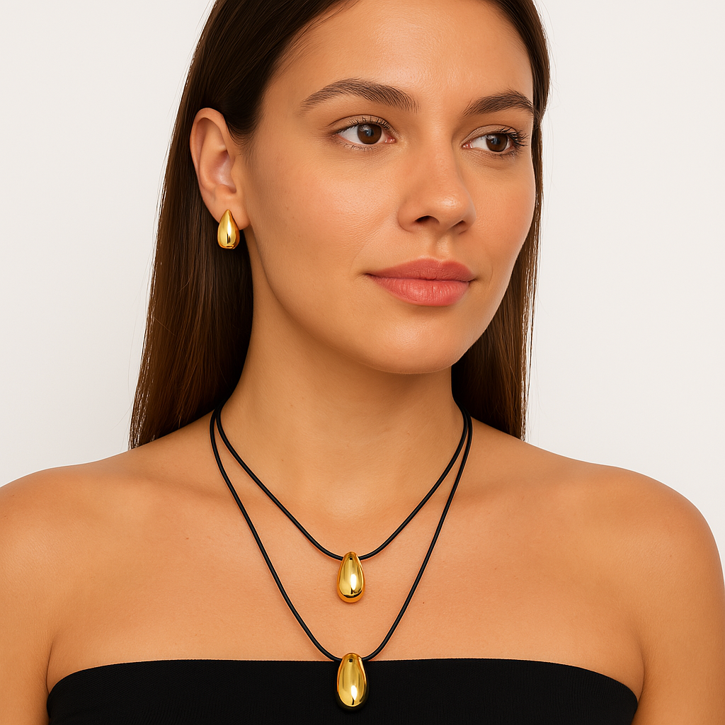 Colar Dois Fios Preto Com Pingente Gota Folheado