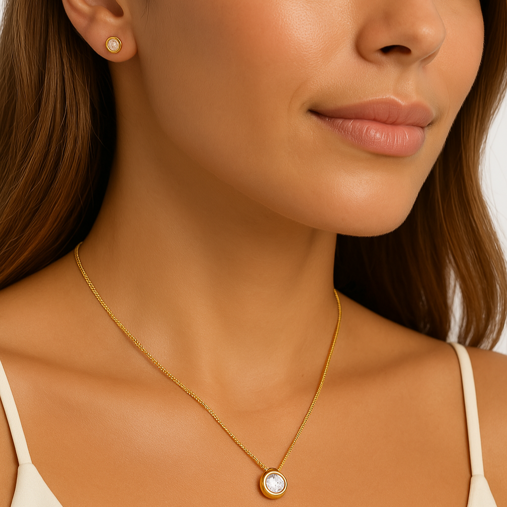 Colar e brinco com zircônia folheado à ouro ou a prata.