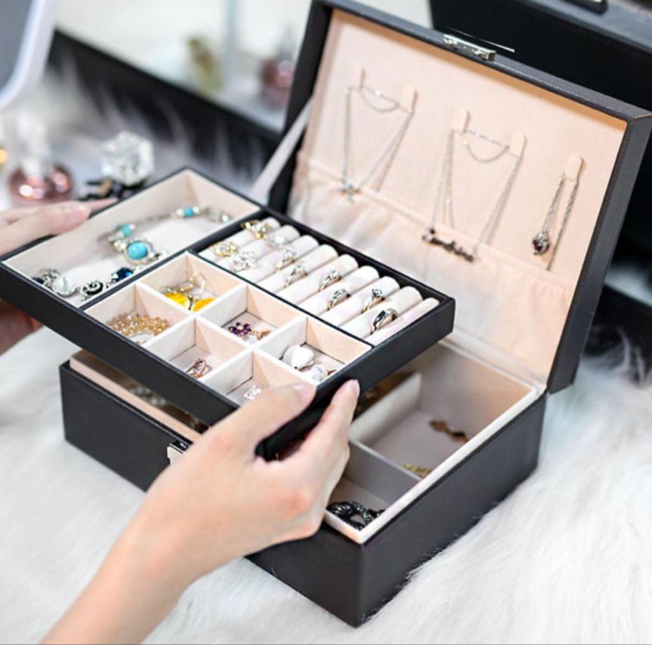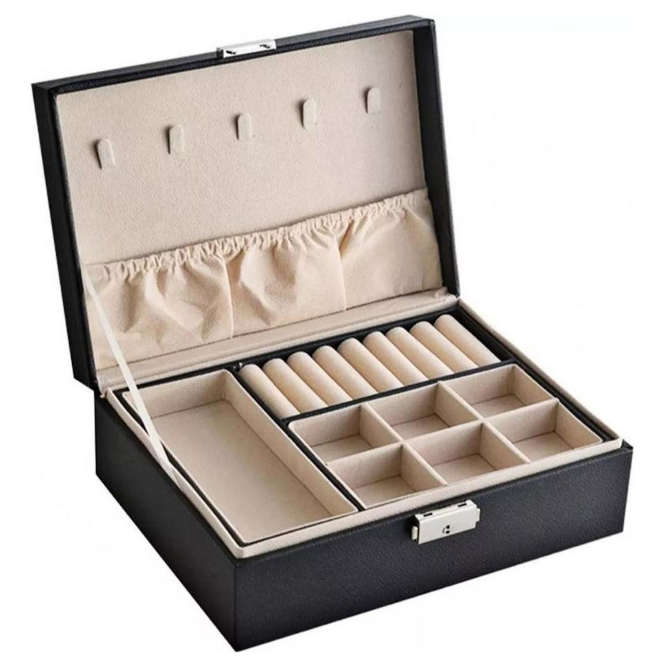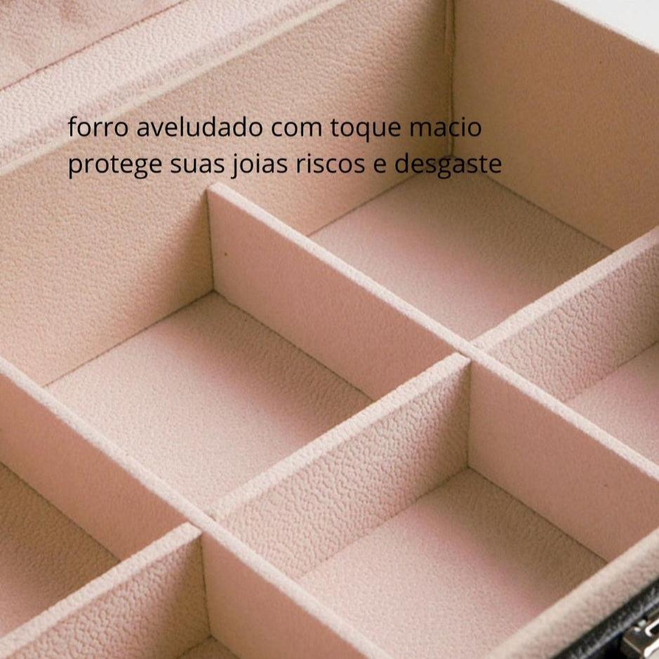 Porta jóias com trava de segurança com chave, em PU para maior durabilidade, dois compartimentos muito mais espaço, forro aveludado, com toque macio, protege suas jóias de riscos e desgastes.. Tamanho:8,5x23x17cm.
