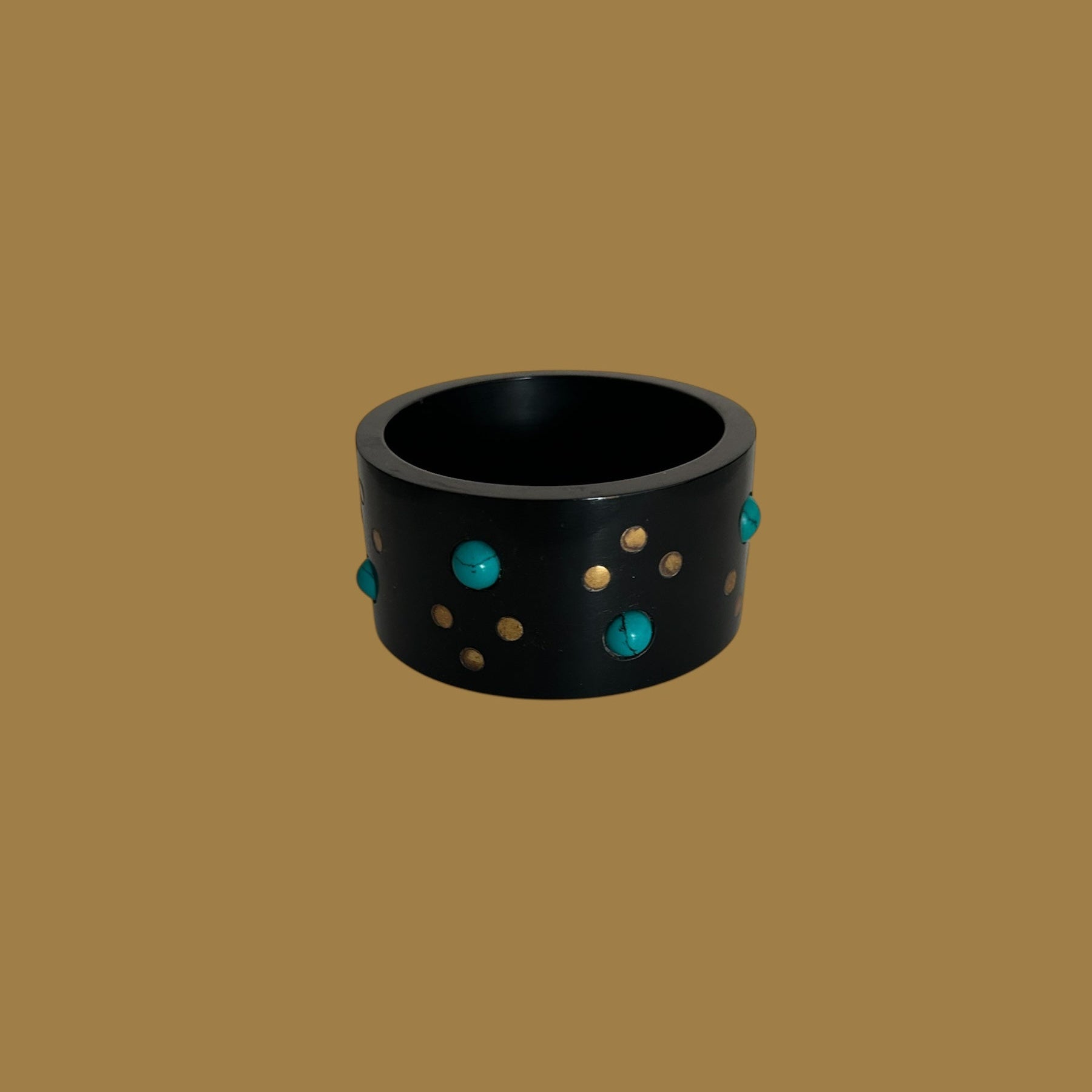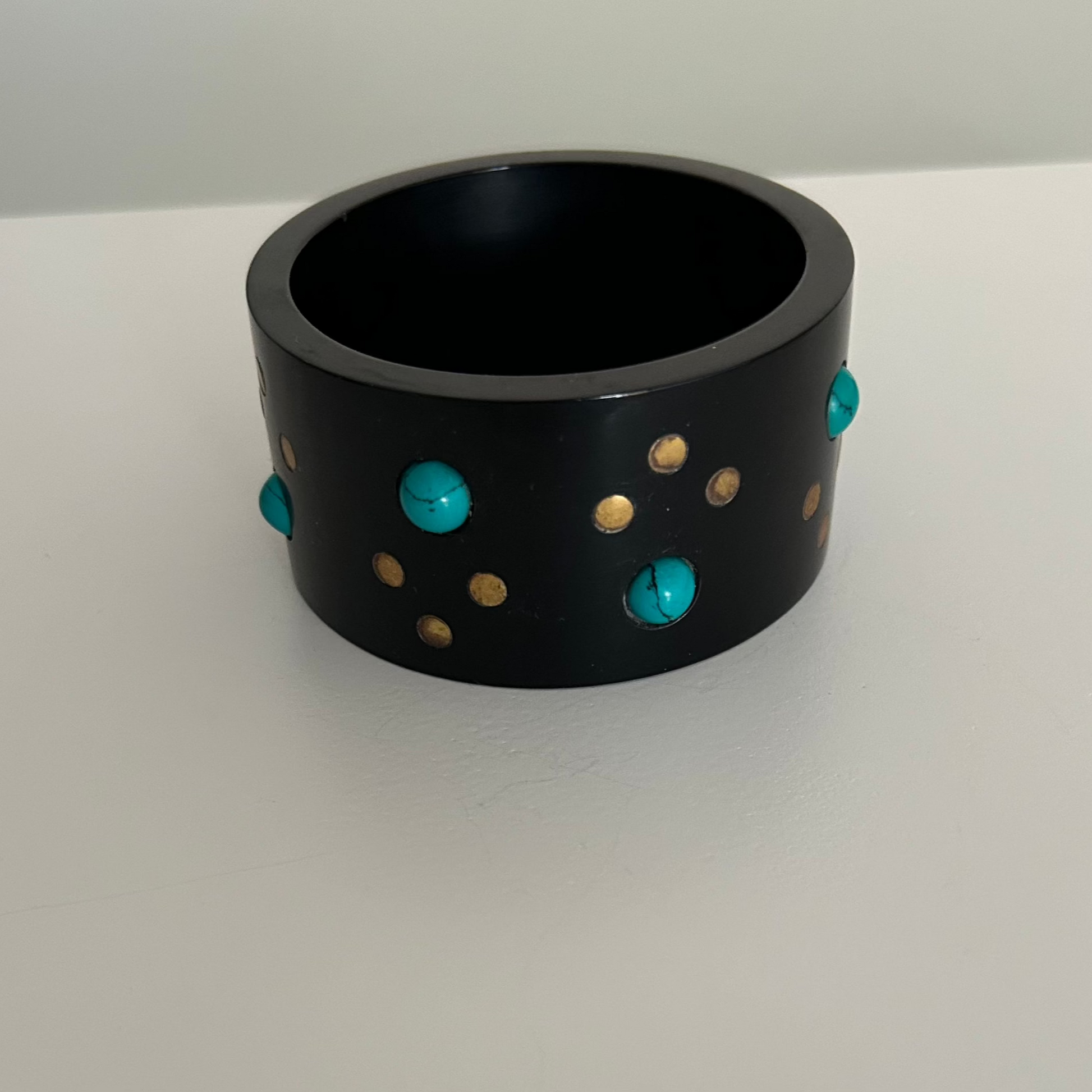 Pulseira Bracelete Indiano Madeira Com Turquesa e Dourado